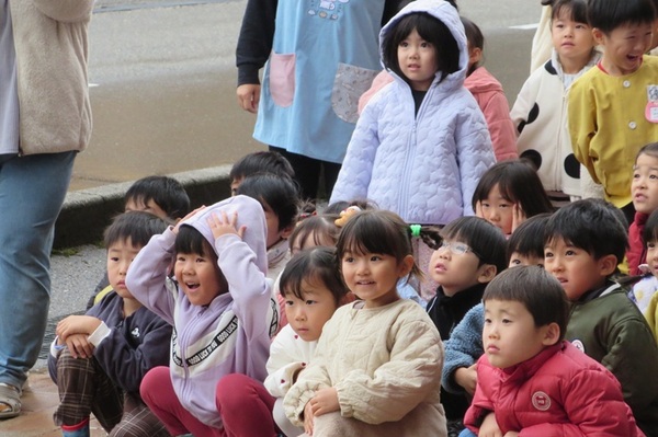 遊戯室では紙芝居による、物を大切に使う話やごみの仕分けについて教わり、ごみ収集職員と一緒に子どもたちが分別チャレンジをしてみました。